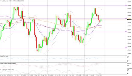 EUR/USD on Friday made an intraday low of US$1.0841/EUR, a high of US$1.0867/EUR, and settled the day up by 0.101% to close at US$1.0855/EUR.