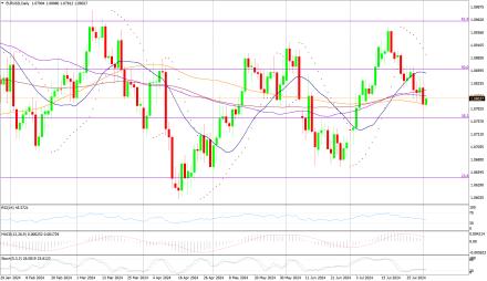 EUR/USD on Thursday made an intraday low of US$1.0776/EUR, a high of US$1.0834/EUR, and settled the day down by 0.313% to close at US$1.0790/EUR.